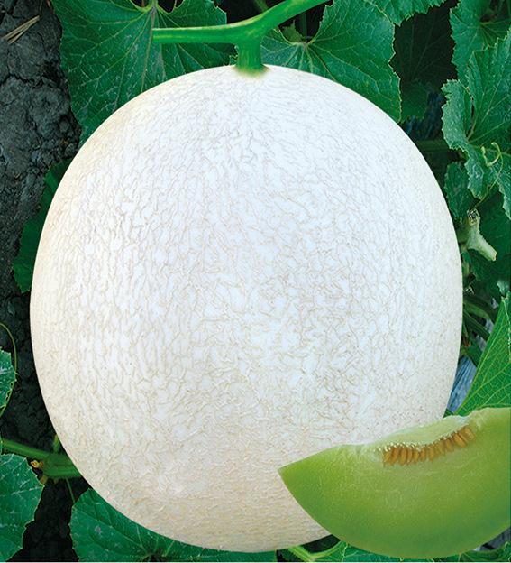 Early maturing F1 sweet melon variety, plant growing is strong, strong disease to resistance, wide adaptability, easy to setting fruit, about 35 days flowering to mature fruit, fruit peel color white, dense net cover the whole melon, it will have yellow halos when have strong sunshine or over maturity, beautiful appearance, flesh diameter above 4cm, the flesh is light green, small fruit cavity, sugar content is about 18%, excellent quality, single plant keep one fruit, single fruit weight 3-4 kg, yield about 24000kg per acre, long shelf life.